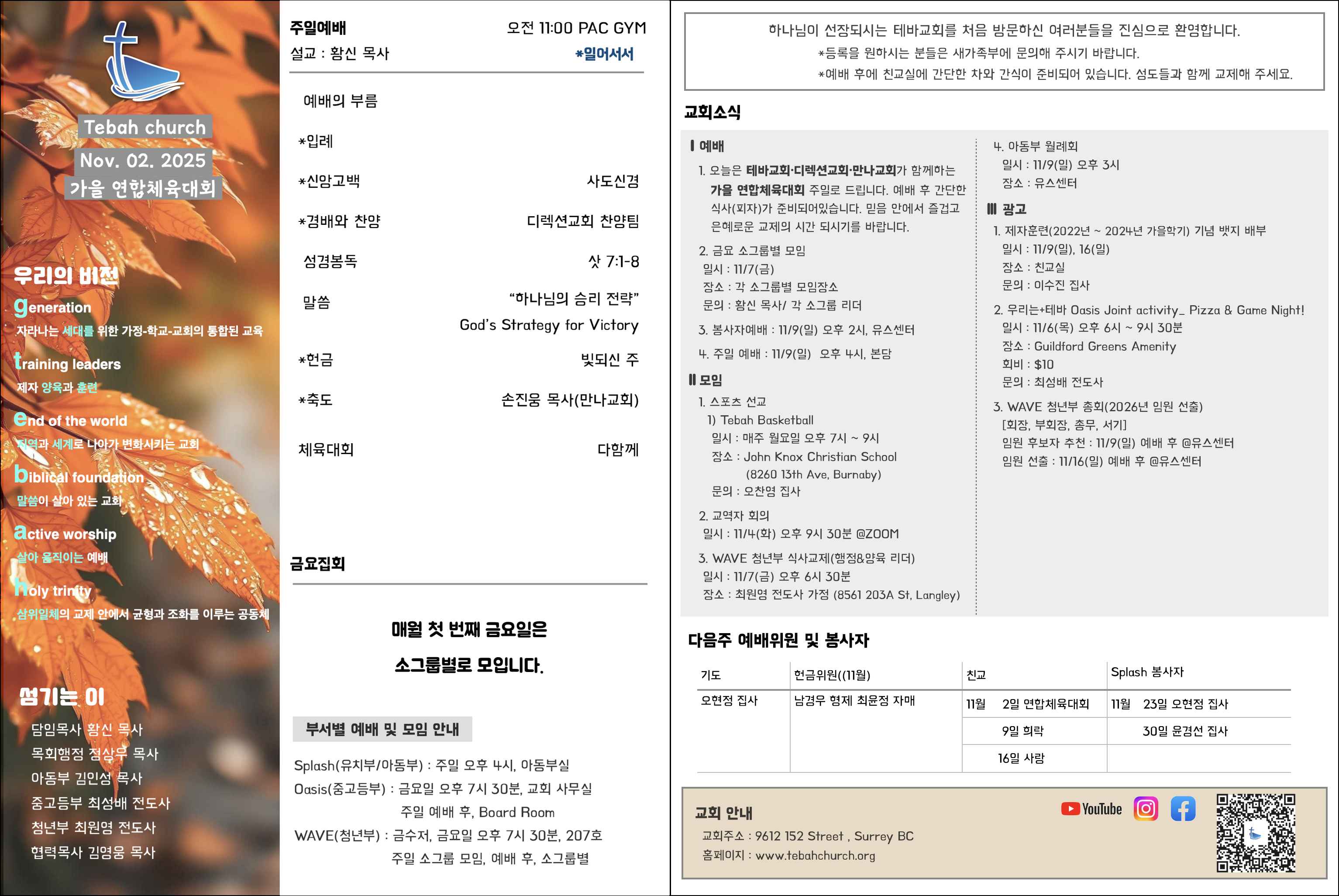 1. 오늘은 테바교회•디렉션교회•만나교회가 함께하는 가을 연합체육대회 주일로 드립니다.