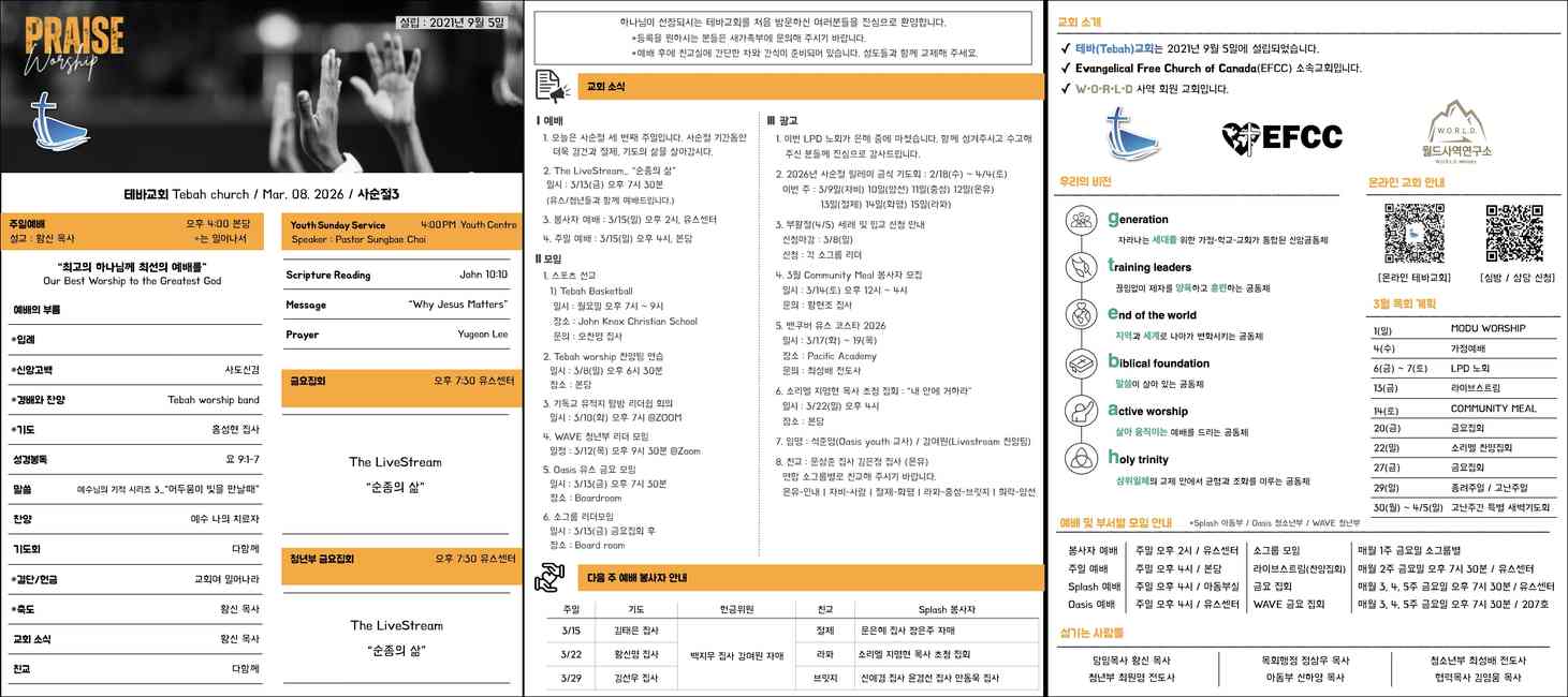 5. 주일 예배 : 3/8(일) 오후 4시, 본당